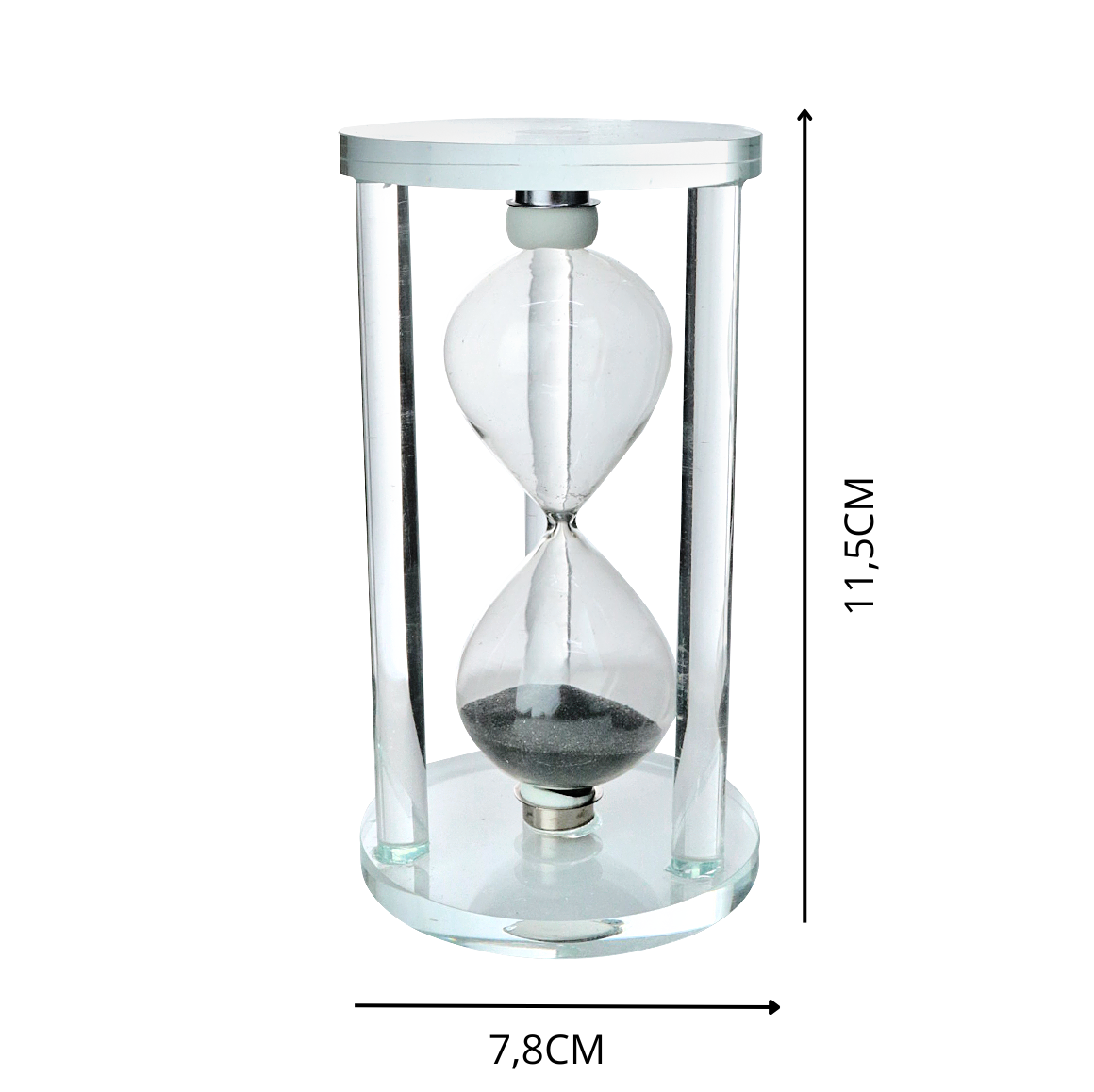 Totalmente produzida em vidro transparente, tanto o corpo quanto a base, a peça permite visualizar a passagem suave da areia, trazendo leveza e equilíbrio à decoração. Um toque de charme para escritórios, salas, quartos ou ambientes de estudo.