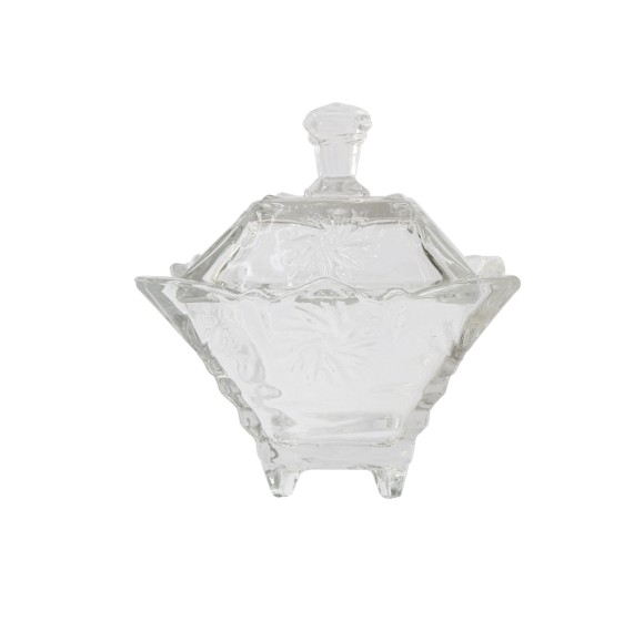 Bomboniere em vidro transparente com pézinhos e tampa para vedação, o que auxilia para que não tenha contato com insetos indesejáveis e até mesmo contato com poeiras na limpeza doméstica.Em forma quadrada com folhagens no alto relevo do vidro que a tornam super delicada. Ideal para Petit four, doces e salgados em pequenas porções.