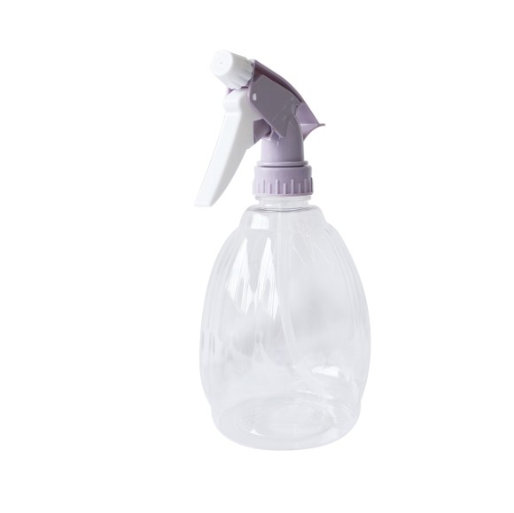 BORRIFADOR COM BICO NA COR LILAS E RECIPIENTE TRANSPARENTE PARA COLOCAÇÃO DO LÍQUIDO DE SUA ESCOLHA.