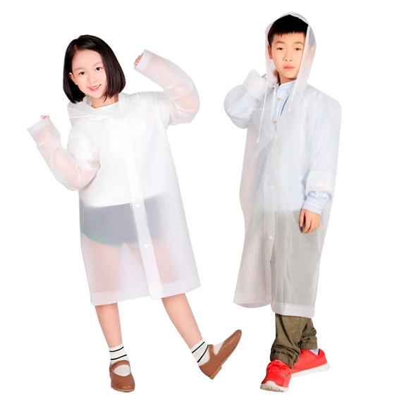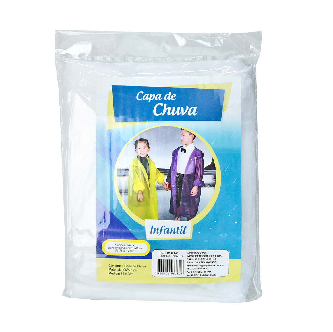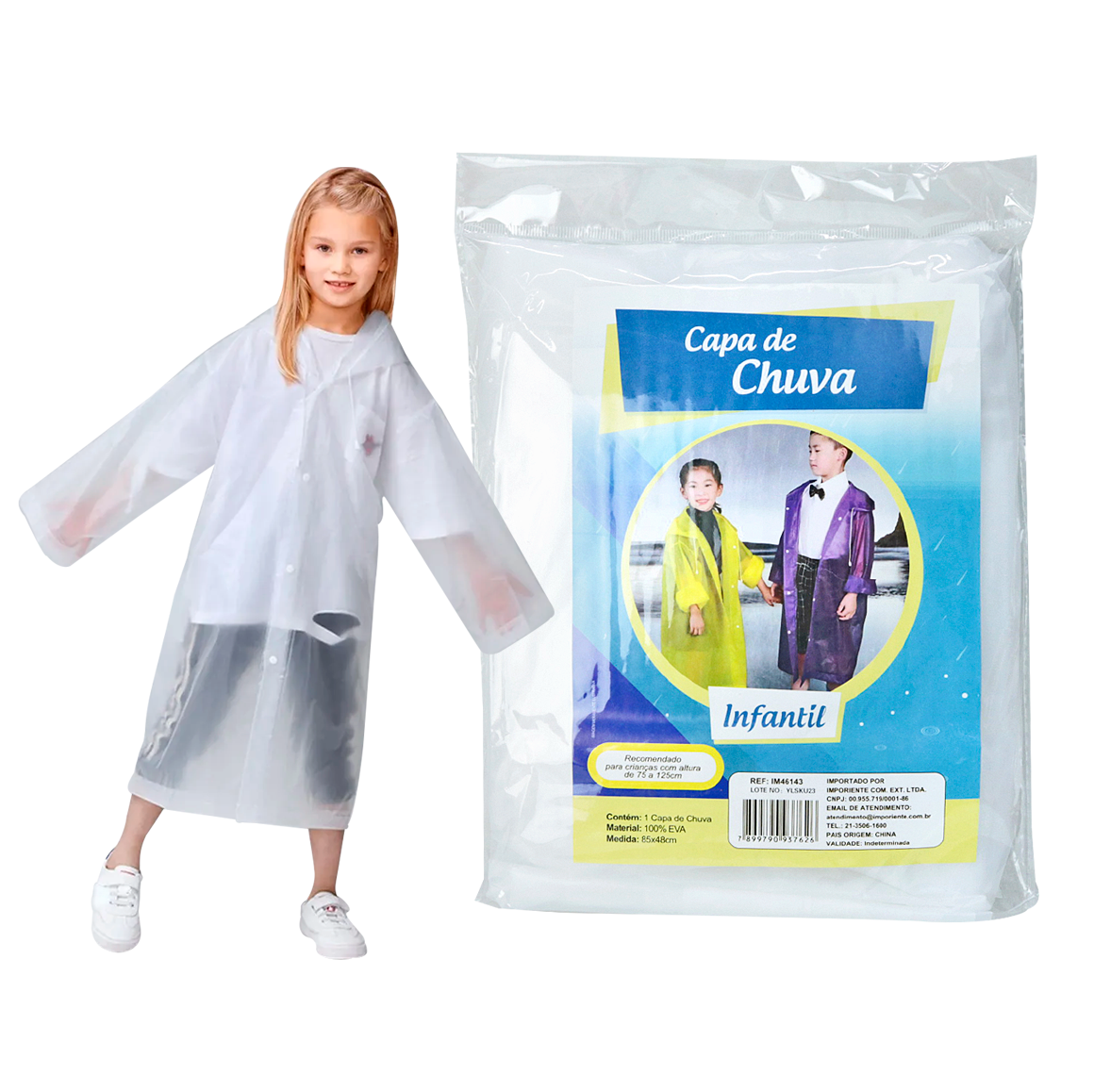 Ideal para manter o corpo seco. Produzido em E.V.A que é um material plástico durável, resistente à água e flexível, o que o torna uma escolha popular para capas de chuva. O capuz protege a cabeça e o rosto da água. É ajustável com um cordão para melhor se adaptar ao tamanho da cabeça. Isso ajuda o capuz no lugar e evita que a água entre por ele. A capa de chuva possui botões de pressão e é recomendado para crianças com altura de 75 a 125cm.