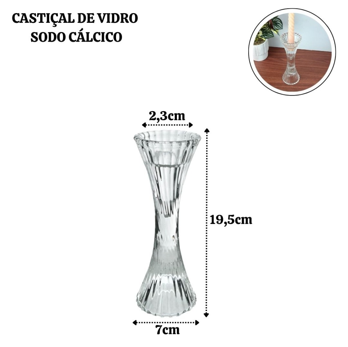 Um castiçal de vidro sodo-cálcico com dimensões de 7cm de diâmetro por 19,5cm de altura é um acessório pequeno, mas elegante. O vidro sodo-cálcico é conhecido por sua transparência e brilho, proporcionando uma estética clean e moderna.O design é texturizado e transparente. O formato compacto do castiçal permite que ele seja usado em diversas decorações de ambientes, como mesas, prateleiras ou jantares à luz de velas, criando uma atmosfera aconchegante e sofisticada.