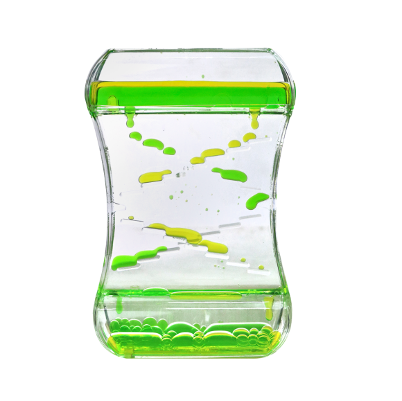 O óleo é cuidadosamente introduzido em ambas as câmaras para garantir que a quantidade e a proporção corretas sejam mantidas.Quando o enfeite é virado de cabeça para baixo, o óleo dentro dele começa a fluir de uma câmara para a outra através do canal central. Este movimento cria padrões fascinantes e hipnotizantes à medida que as bolhas de óleo sobem ou descem. À medida que as bolhas se movem, elas refletem e refratam a luz de maneiras interessantes, criando um espetáculo de cores.