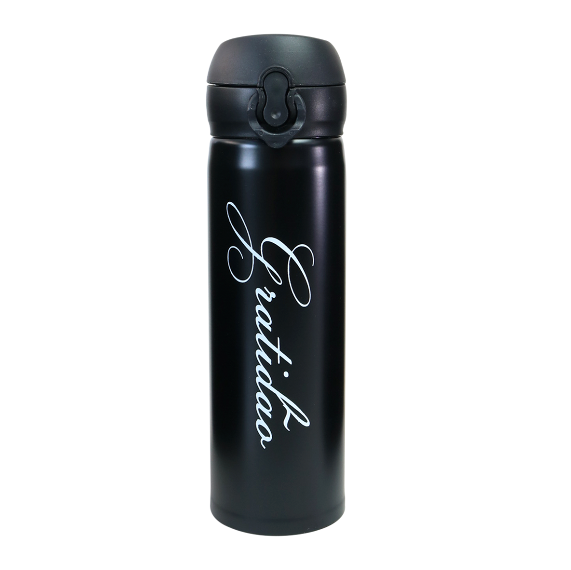 Pode ser usado tanto em bebidas quentes quanto em geladas. Sistema de fechamento que impede vazamentos. Bocal mais largo para acomodar cubos de gelo. Possui design arrojado. Frase." Gratidão".