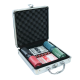 A maleta de Poker com chave é um conjunto completo para os amantes do jogo de cartas. Feita de material durável, como alumínio resistente, a maleta possui um acabamento elegante e vem com uma chave para travá-la, garantindo a segurança e a privacidade dos componentes internos. O conjunto também contém cinco dados que são usados para jogar diferentes variações de poker ou outros jogos. Eles são feitos de plástico e têm um tamanho padrão. A maleta contém 100 fichas de poker (25 de cada) e têm diferentes denominações, permitindo que os jogadores façam apostas em valores variados. Além disso o conjunto inclui dois baralhos completos de 52 cartas cada um. Os baralhos são feitos de papel de alta qualidade, com um acabamento suave e deslizante, permitindo uma fácil distribuição e manuseio das cartas. As faces das cartas têm designs clássicos e detalhados, facilitando a identificação de cada carta.