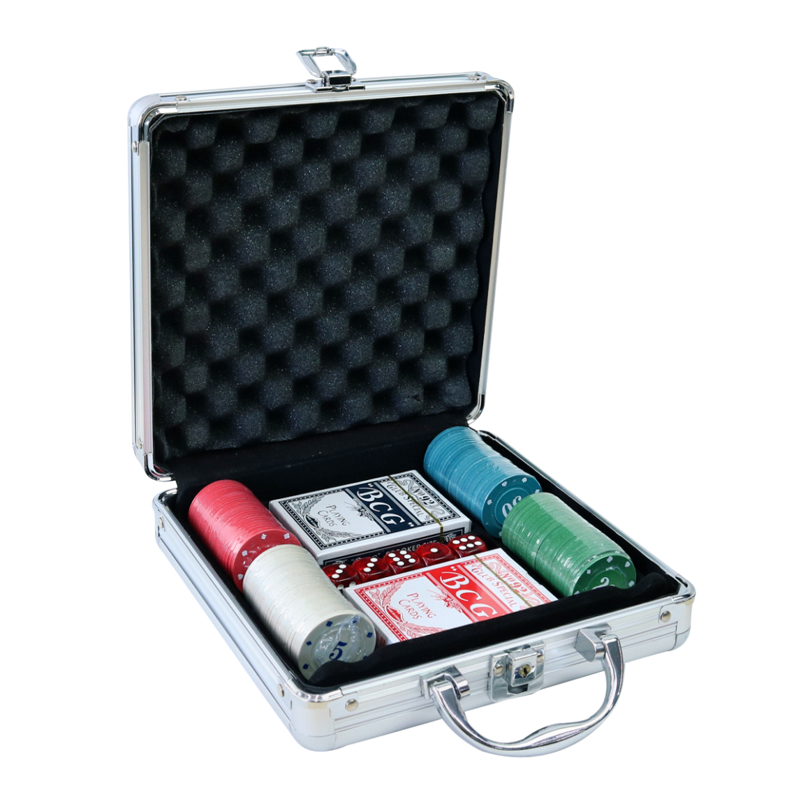 A maleta de Poker com chave é um conjunto completo para os amantes do jogo de cartas. Feita de material durável, como alumínio resistente, a maleta possui um acabamento elegante e vem com uma chave para travá-la, garantindo a segurança e a privacidade dos componentes internos. O conjunto também contém cinco dados que são usados para jogar diferentes variações de poker ou outros jogos. Eles são feitos de plástico e têm um tamanho padrão. A maleta contém 100 fichas de poker (25 de cada) e têm diferentes denominações, permitindo que os jogadores façam apostas em valores variados. Além disso o conjunto inclui dois baralhos completos de 52 cartas cada um. Os baralhos são feitos de papel de alta qualidade, com um acabamento suave e deslizante, permitindo uma fácil distribuição e manuseio das cartas. As faces das cartas têm designs clássicos e detalhados, facilitando a identificação de cada carta.