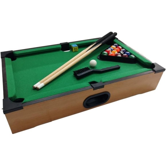 O jogo de sinuca de mesa de madeira é uma versão em escala reduzida do popular jogo de sinuca, projetado para ser jogado em mesas menores ou espaços limitados. Este conjunto inclui todos os elementos essenciais para uma experiência completa de sinuca. A mesa é feita de material resistente e de qualidade, tecido aveludado e tacos de madeira. Fácil de transportar, ideal para se divertir em qualquer lugar, é só colocar em uma superfície plana e aproveitar com amigos. Além de ser uma ótima opção para presentear.
