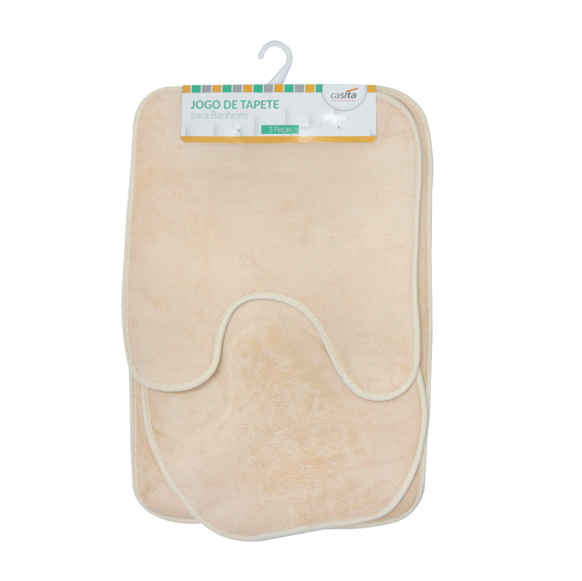 Jogo de tapete para banheiro de uso externo com 03 peças com uma pelagem curta e soft. Produto de excelente qualidade super sofisticado e com detalhes na costura e com a parte de contato com o chão antiderrapante.