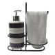 Sofisticado kit com porta sabonete líquido, porta sabonete em barra e suporte metálico para toalha.