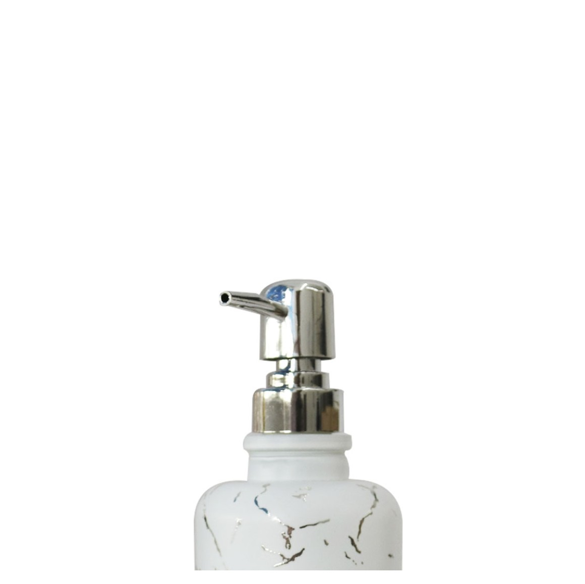 Jogo de Banheiro em vidro com estampa marmorizada e tampa cromado de plástico.