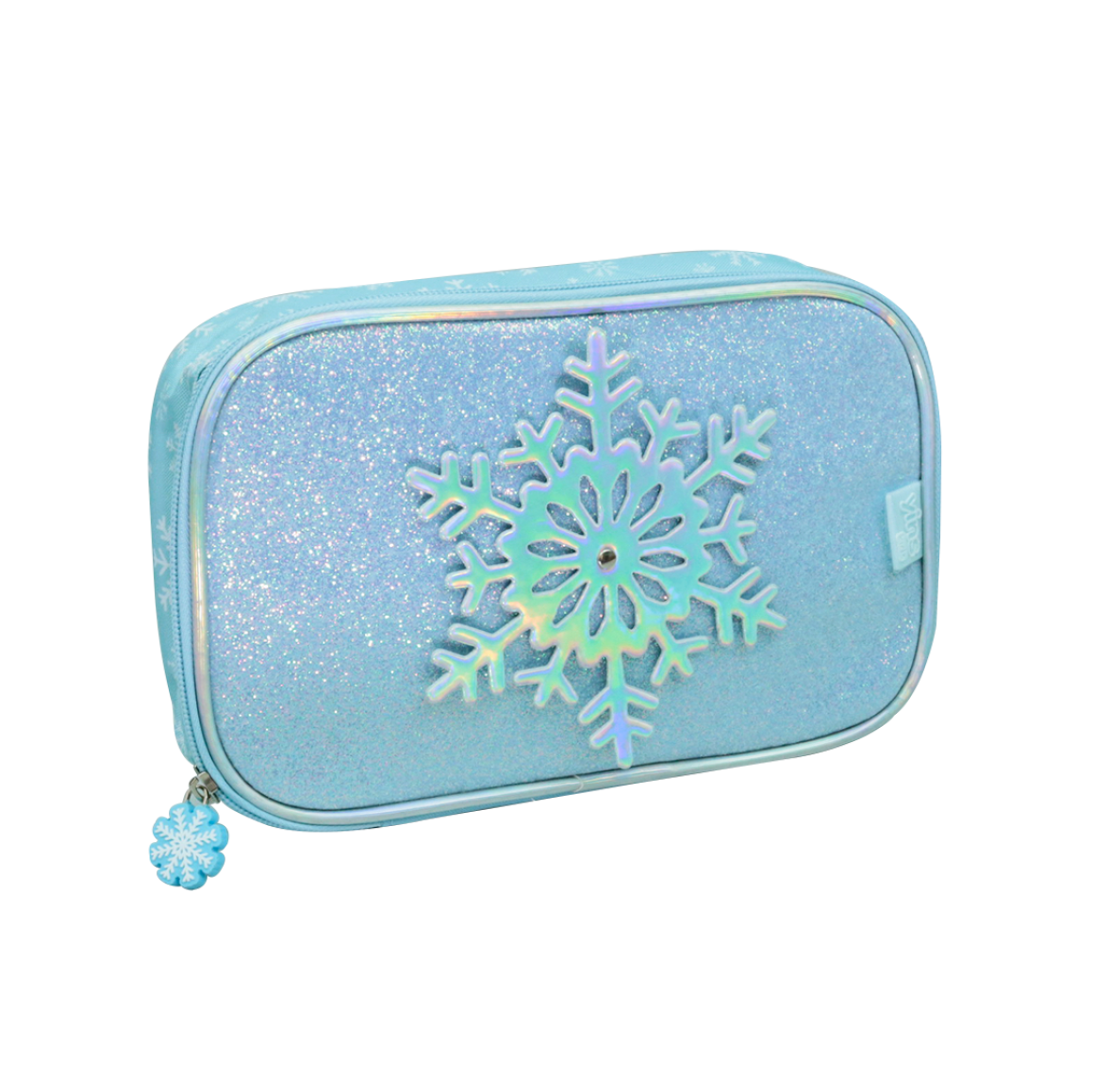 também possui o mesmo tema de flocos de neve e é acentuada com brilho. O estojo possui um zíper resistente para
