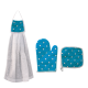 Um kit que inclui uma luva para forno, um descanso de panela e panos de