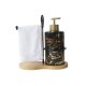 Sofisticado kit com porta sabonete líquido e suporte metálico para toalha.