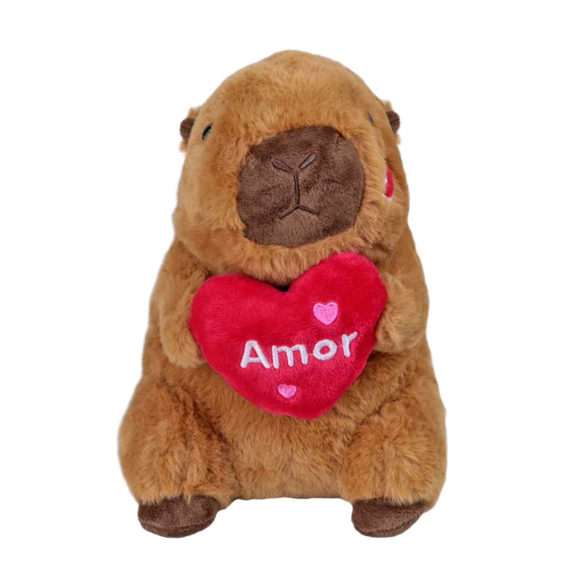 Encantadora e cheia de ternura, essa pelúcia de capivara conquista à primeira vista! Com um desenho de boquinha no rosto, que dá ainda mais personalidade ao seu jeitinho calmo e simpático, ela segura entre as patinhas um coração com a palavra "Amor" – perfeito para expressar carinho de forma divertida e fofa.