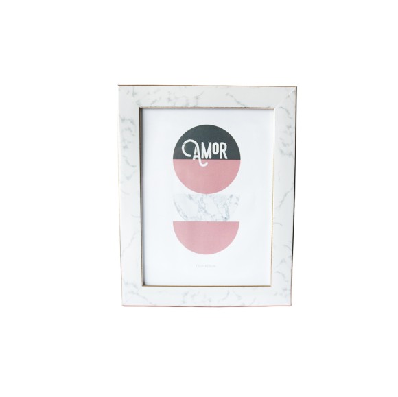 Porta retrato com design único e exclusivo em estampa marmorizada com pé de gravata de madeira e fio dourados nas laterais.