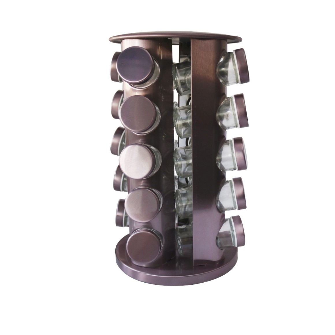 Porta tempero giratório com base redonda e com 20 potes de vidro para armazenamento de temperos e ervas.